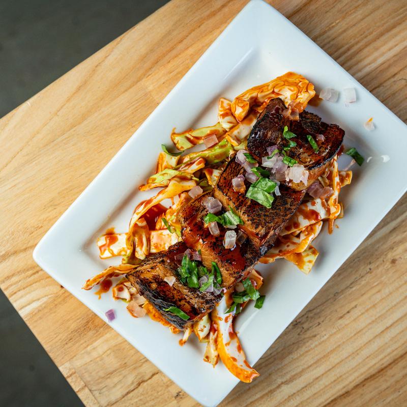 Four pieces of smoked pork belly, braised and seared. Served over Gochujang slaw.